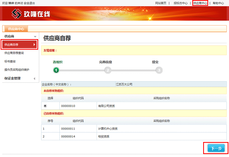 1進(jìn)入“供應(yīng)商中心—供應(yīng)商自薦”,選擇采購組織,點(diǎn)擊下一步
